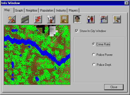 buttons to choose between displaying Crime Rate, Police Power, and Police