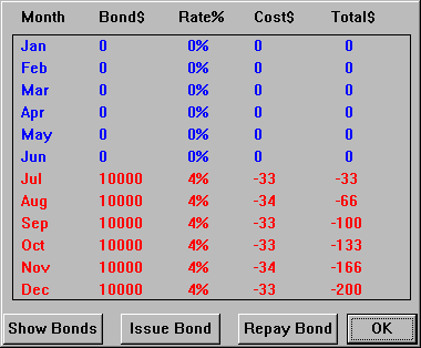 Issue Bond opens a dialog that tells you the current interest rate for bonds