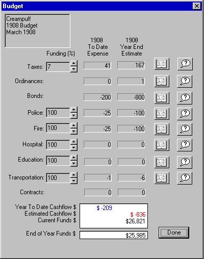 The Budget window reports and lets you adjust your city's budget. It automatically