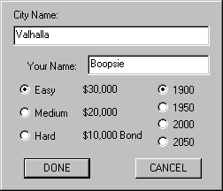 This command is used by the player that wants to host the game, becoming the server machine. This command will prompt the City Name dialog, where you enter your city's name and your player name into the text boxes. Choose the difficulty level and the time scale, and hit Done to start buying, building and boondoggling in your new city.